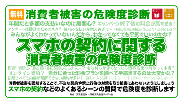 以前のイベント用に作成した啓発物 「スマホ関連の契約に関する消費者被害の危険度診断」大阪府消費者フェア2023にて出展で、府民に消費者被害の理解を深める取り組みを実施