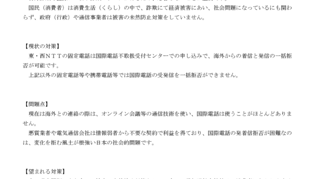 消費者団体から行政や国会への意見表明 特殊詐欺電話対策や国際ワン切り詐欺の未然防止対策に、国際電話の受発信を一括拒否の選択肢を設けるよう、政府に意見しました。